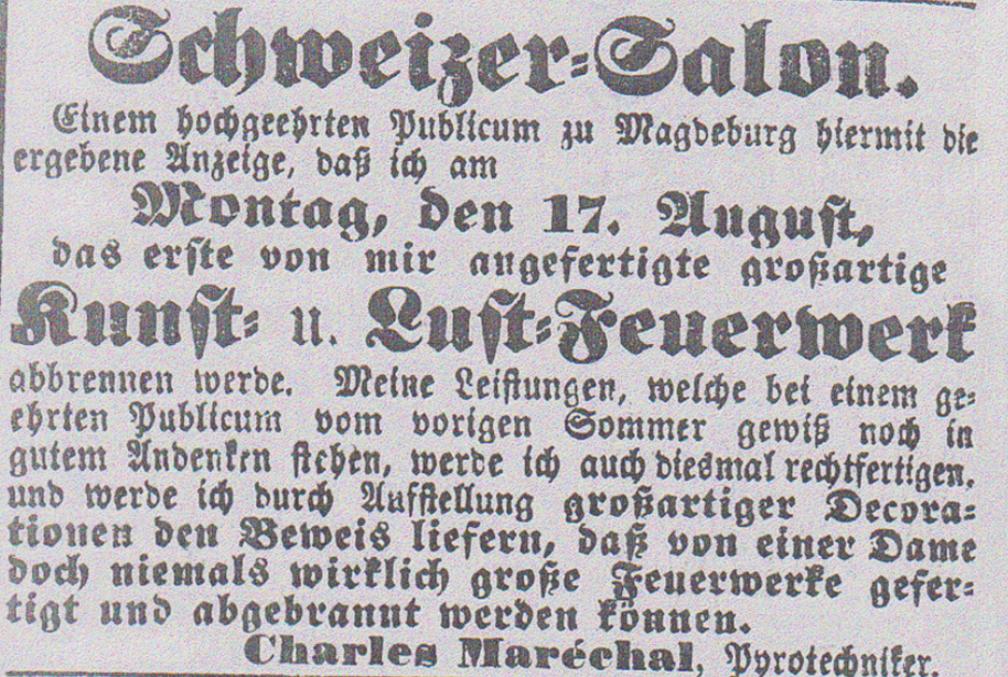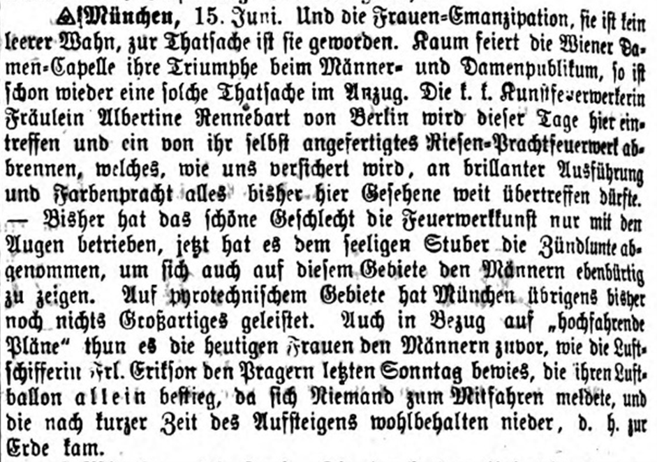 Am 31. August 2025 jährt sich der Geburtstag von Albertine Emma Rennebarth zum 180. Mal. Albertine wer…?! Der Name der kaiserlich-königlichen Kunstfeuerwerkerin ist auch in pyrotechnischen Fachkreisen nur wenigen geläufig. Und dennoch: Albertine Rennebarth ist eine der bedeutendsten Persönlichkeiten der Geschichte der Feuerwerkerei im deutschsprachigen Raum. Sie war die erste Frau, die die Prüfung zur Kunstfeuerwerkerin am königlich-preußischen Feuerwerks-Laboratorium ablegte. Damit ist sie vermutlich die erste staatlich geprüfte Pyrotechnikerin Deutschlands – und hatte erhebliche Signalwirkung für die Emanzipation der Frauen in der Pyrotechnik und weit darüber hinaus.