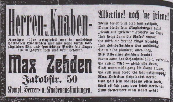 Am 31. August wird Albertine Emma Rennebarth in der Berliner Linienstraße Nr. 115 als siebtes von acht Kindern des Schlossermeisters August Ludwig Rennebarth (1809-1865) und Margarethe geb. Huber (1809-1887) geboren. Schon in jungen Jahren zeigt Albertine ein ausgeprägtes Interesse an Technik, Mechanik und Chemie. Mit 14 Jahren beginnt sie eine sechsjährige Ausbildung bei einem erfahrenen Feuerwerker. Sie lernt nicht nur den sicheren Umgang mit Schwarzpulver und Effektsätzen, sondern auch die Dramaturgie eines gelungenen Feuerwerks. Im Rahmen der Ausbildung reist sie zum ersten Mal in ihre spätere Wahlheimat Magdeburg. Im Jahr 1865 schließt sie ihre Lehre mit einer erfolgreichen Examensprüfung vor der Artillerie-Kommission des königlich-preußischen Feuerwerks-Laboratoriums in Berlin Spandau ab – als erste Frau überhaupt.